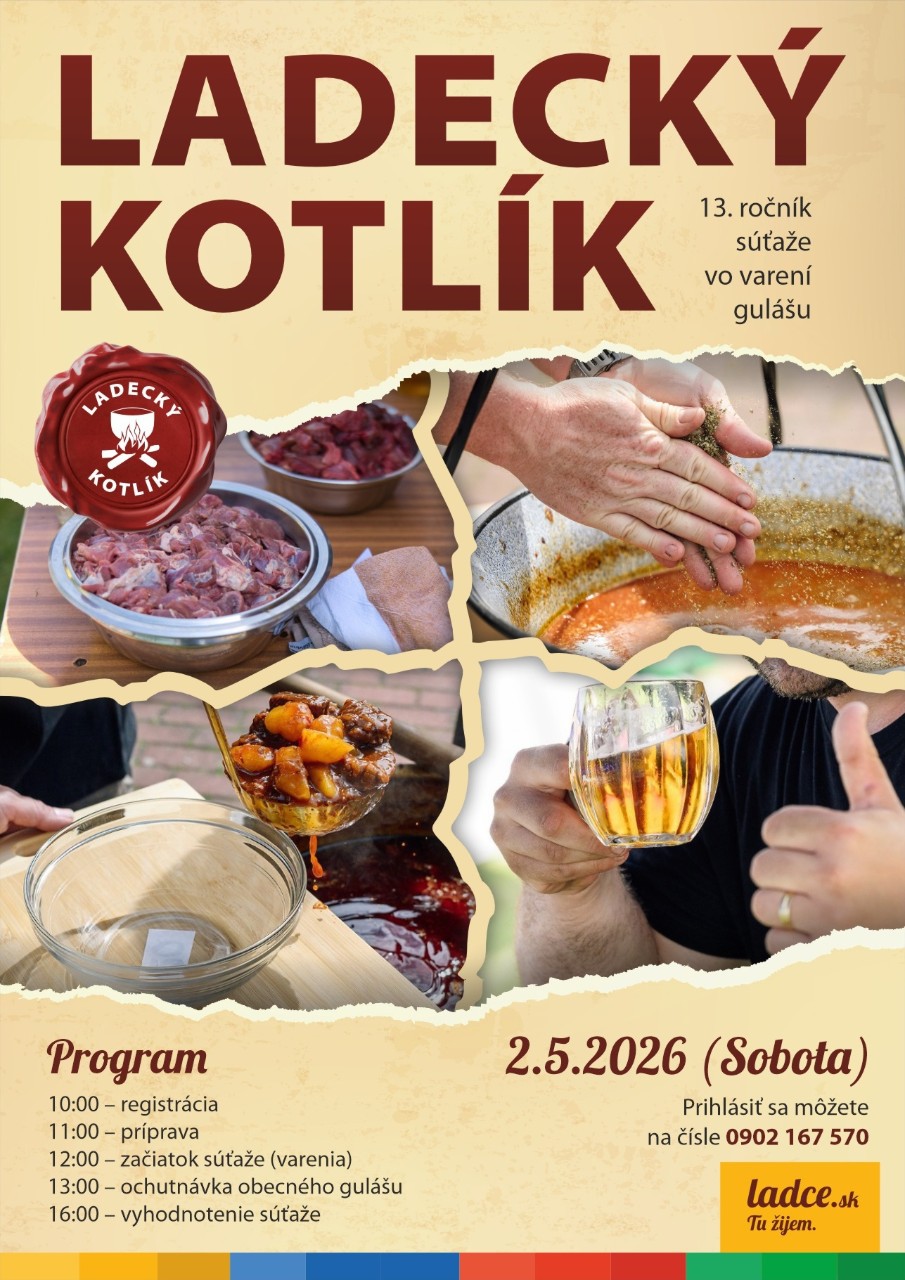 Srdečne všetkých pozývame na 13.ročník súťaže vo varení gulášu Ladecký kotlík 2026, ktorý sa bude konať 02.05.2026 za DK Ladce.