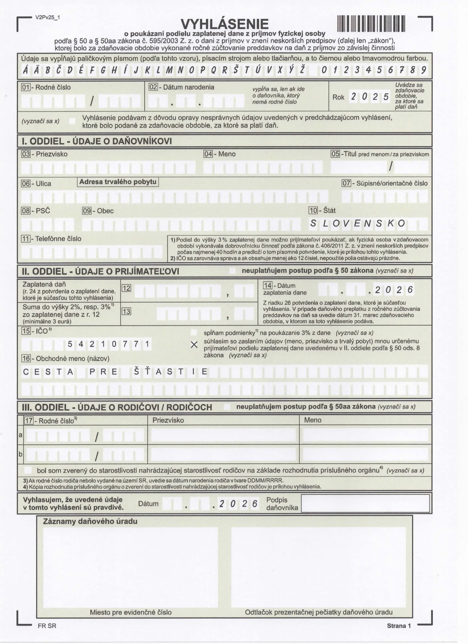 Vyhlásenie 2% - potrebné kontaktovať 0911 939 997 |