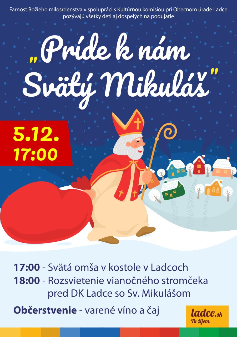 V piatok 5.12.2025 sa program začne slávením sv. omše o 17.00 hod. v kostole Božieho milosrdenstva a následne pred Kultúrnym domov v Ladcoch o 18.00 hod. spoločne so Svätým Mikulášom rozvietime vianočný stromček.